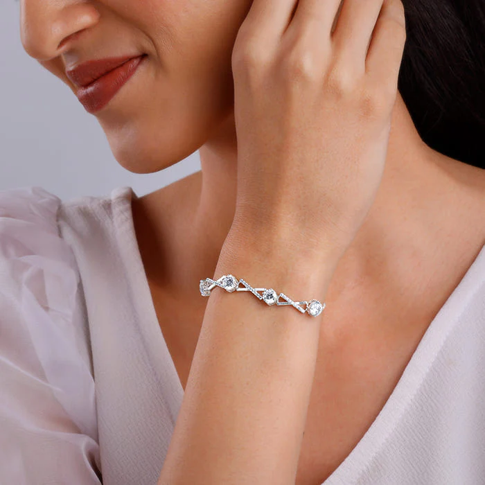 This silver bracelet features circular designs and cross motifs alternatively arranged, and set with zircons.