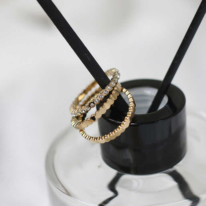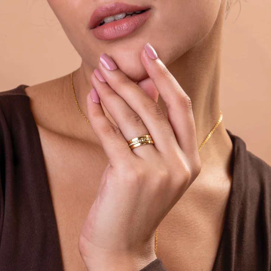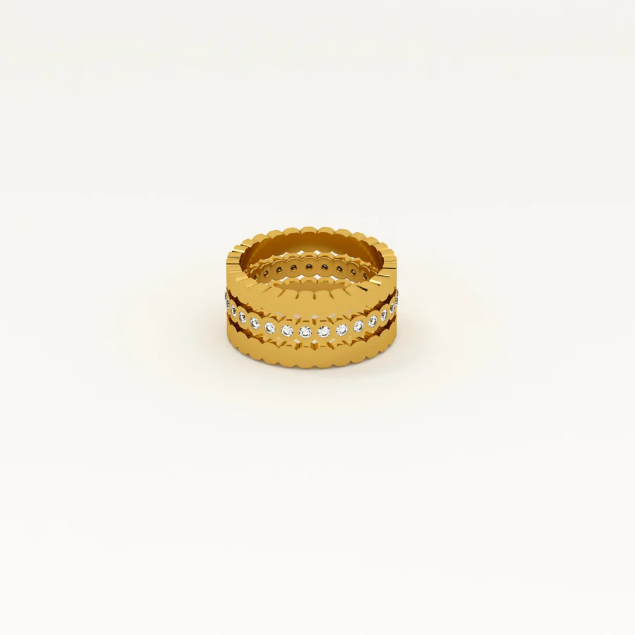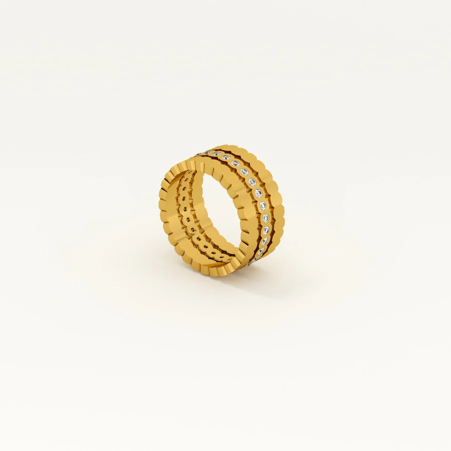 The Three Piece Honeycomb Ring is a stylish jewellery set crafted from stainless steel with 18k gold plating. Featuring white cubic zirconia accents, these stackable rings are waterproof and anti-tarnish, perfect for everyday wear. Their unique honeycomb design adds modern elegance, allowing versatile styling whether worn together or individually, making them a must-have addition to any jewellery collection.